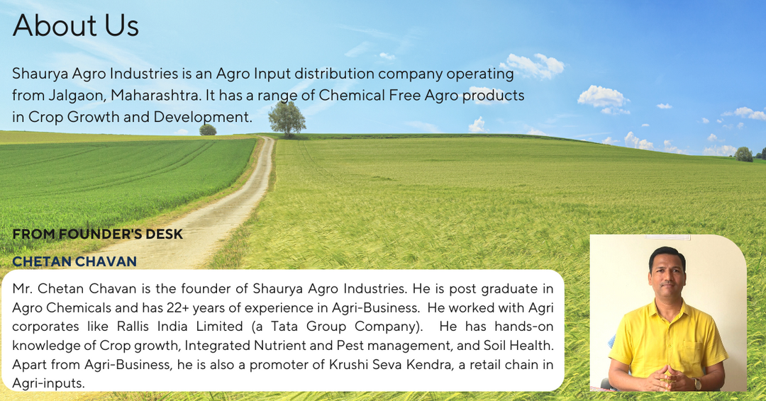 Welcome to Shaurya Agro Industries, your trusted partner in agricultural excellence. We specialize in providing premium-quality agri inputs tailored for optimal plant growth and development. With a commitment to quality, innovation, and sustainability, we strive to empower farmers and growers with the best solutions for their needs. Our extensive range of products is meticulously curated to ensure maximum effectiveness and efficiency in enhancing crop yields. At Shaurya Agro Industries, we prioritize customer satisfaction and aim to exceed expectations through our dedication to excellence. With years of experience and expertise in the field, we are your go-to source for all your agricultural input requirements. Join us in cultivating a greener, healthier future for agriculture. Explore our offerings and experience the difference with Shaurya Agro Industries today.