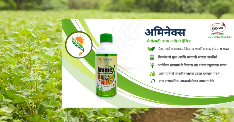 Drip Irrigation: 500ml of Aminex 3 times through drip irrigation at Vegetative, Flowering and Fruiting stages. For all crops like Cotton, Ginger, Turmeric, Onion, Potato, Pluses & Fruit crops.